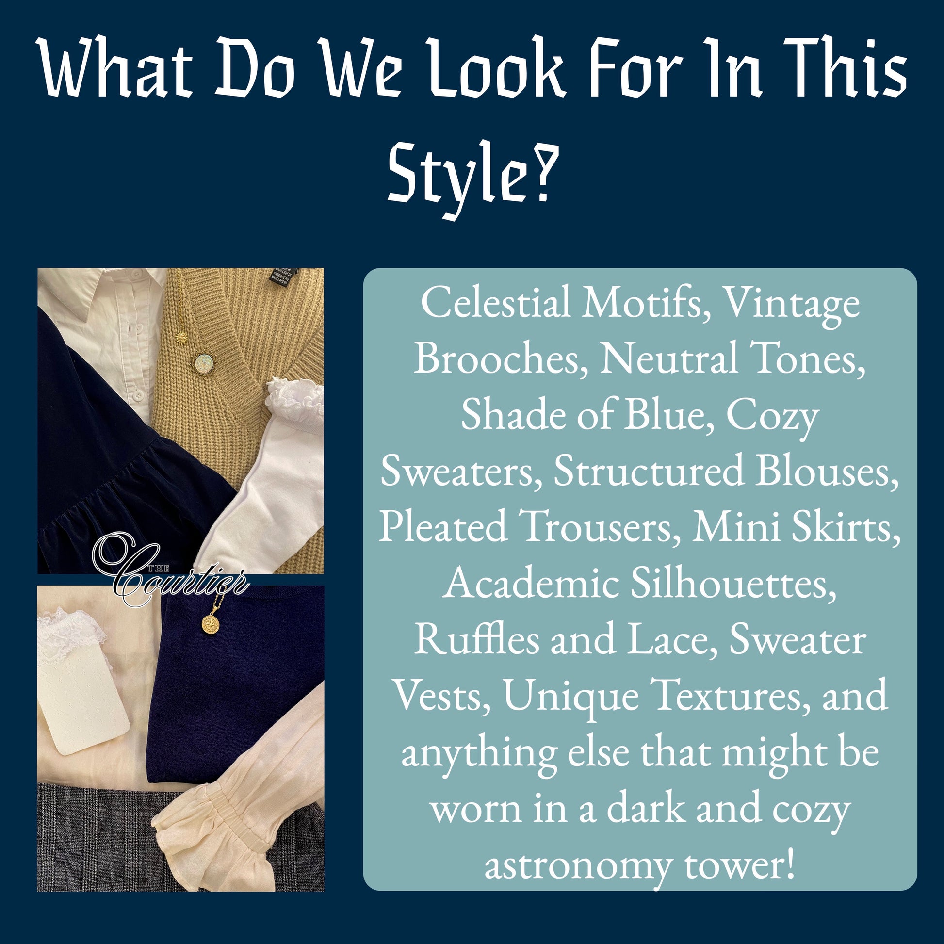 Ignited by a profound fascination with celestial wonders, the astronomer's apprentice emanates an air of refined sophistication with their dark hues and insatiable thirst for other worldly knowledge. Embracing cosmic motifs, they intertwine intellectual pursuit with the elegance of astrology-inspired attire, inviting the scholarly-minded to embark on a journey of cosmic discovery. This style should make you feel as though you are engrossed in a serene library, your gaze fixated on antique star maps, captivated by the ethereal dance of constellations while you unravel the mysteries of the night sky.