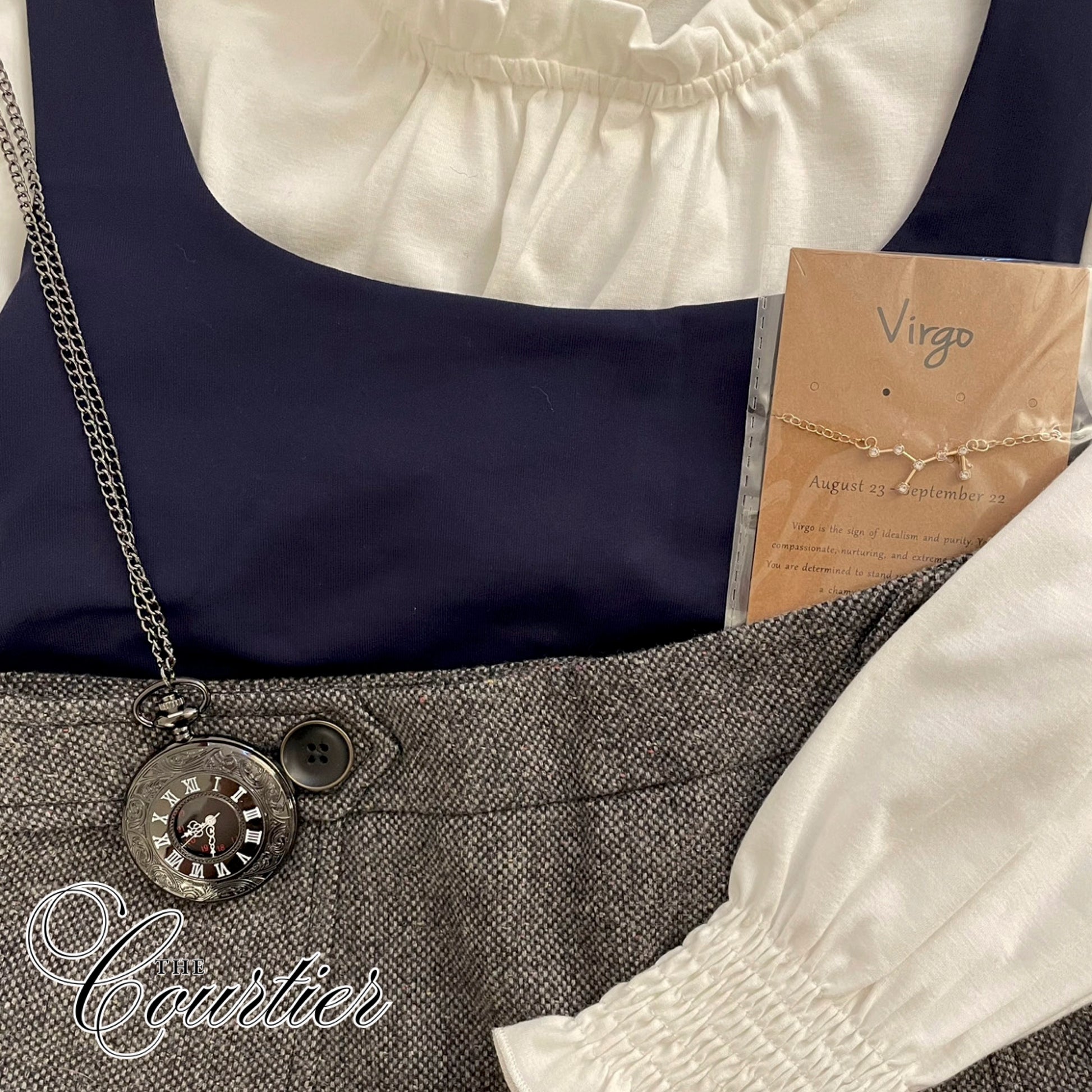 All astronomy apprentice accessory necessities (Pashmina, stick pin, delicate foulard, brooch, pendant necklace, bracelet or earrings, pocket watch, satchel, cufflinks, hair clip)